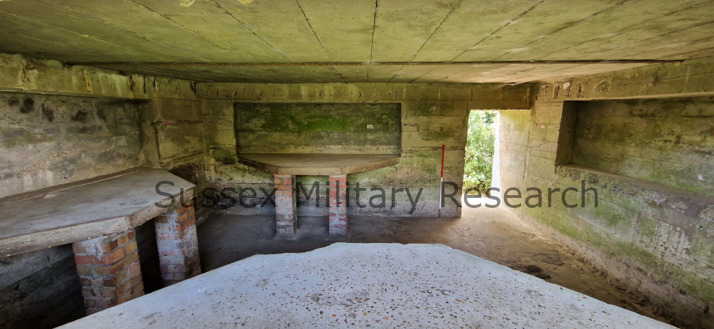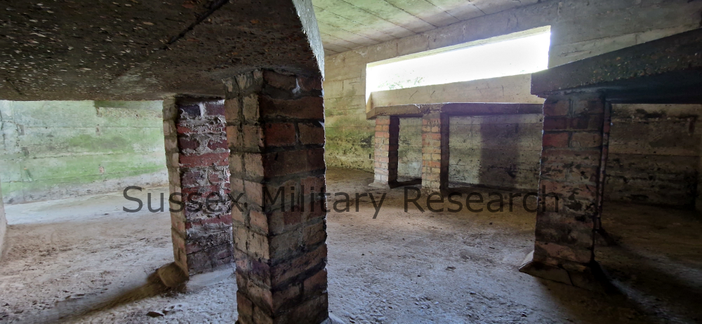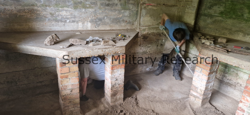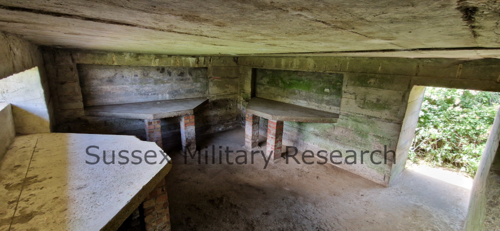 The pillbox was designed for the Vickers machine gun, concrete tables being built under each of the embrasures. From the photos you can see that only one embrasure is still open, facing out across the River Brede and Camber Castle. The blocking up of the other loopholes was probably done not too long after construction for safety reasons and to focus the fire from the pillbox in a particular direction. One of the tables had been removed at some point; we were later to find the footings of the brick legs under all the soil.