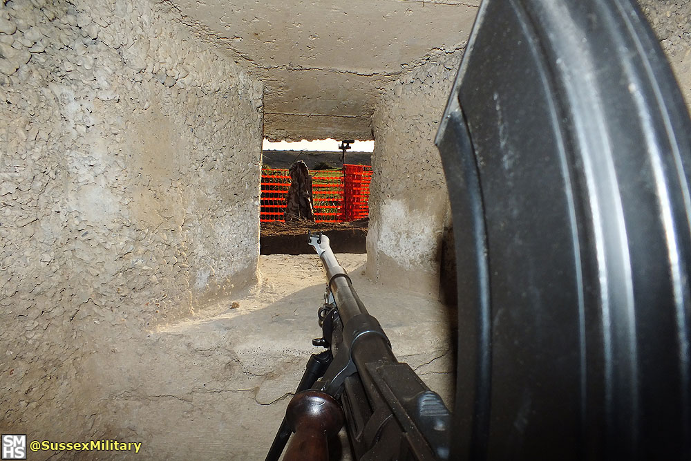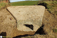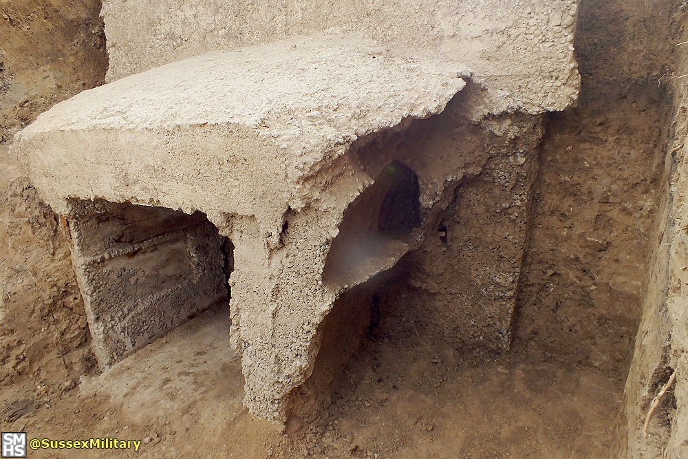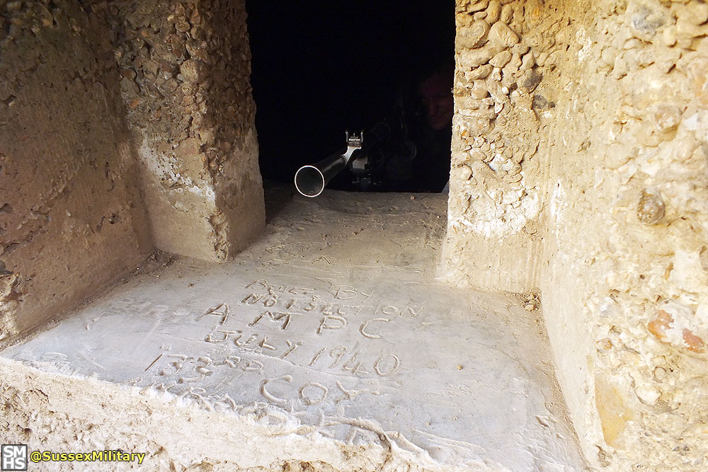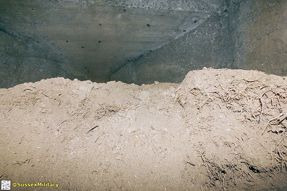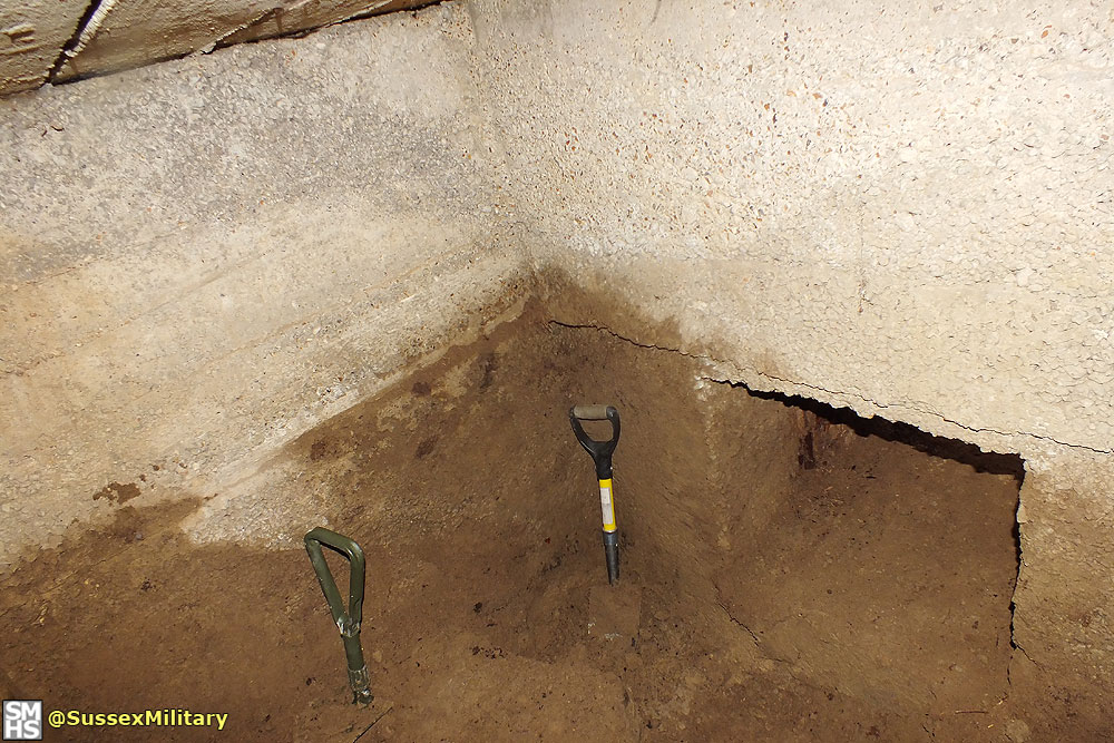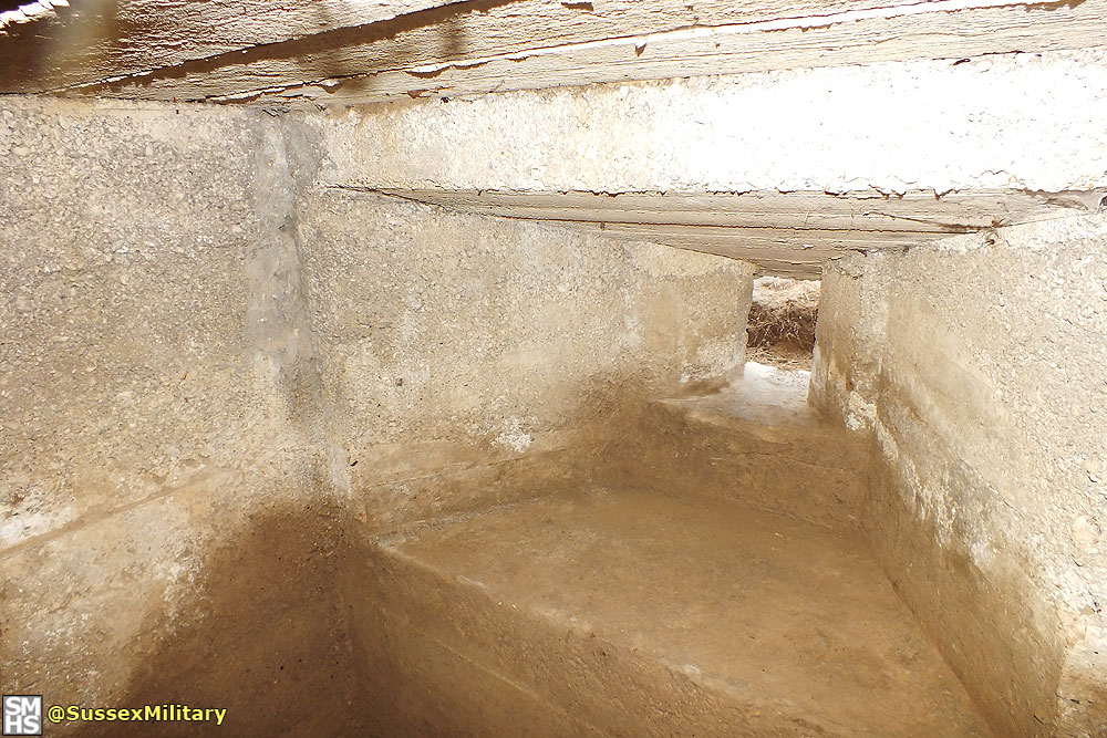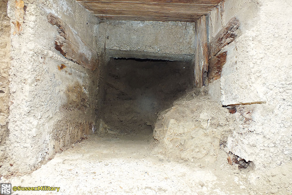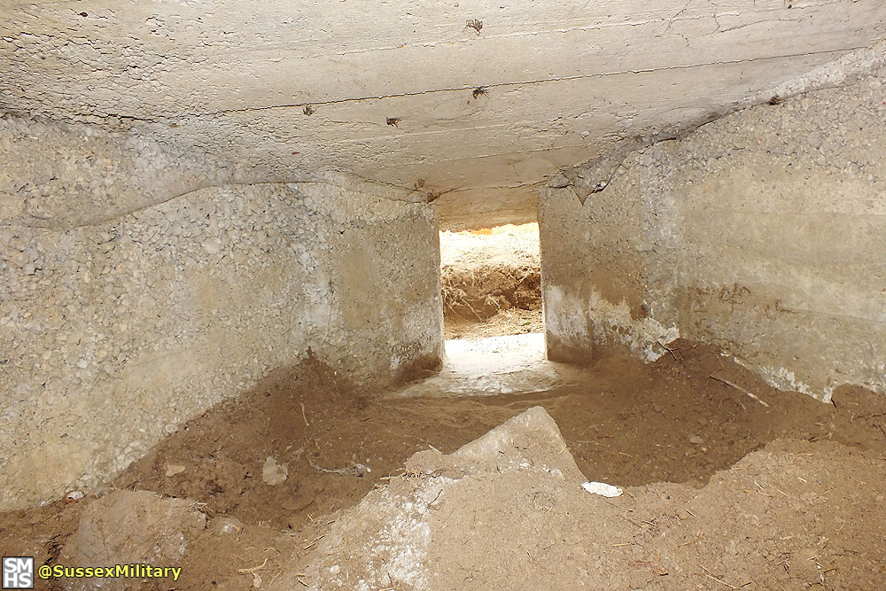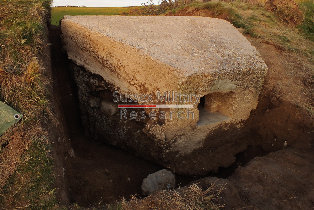 According to graffiti found in the embrasure, the pillbox was built by the Pioneer Corps in July 1940. Of unique design, construction was of very poor quality. The entrance tunnel retained pieces of wooden shuttering.