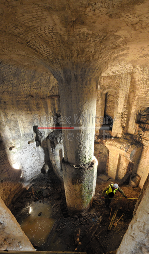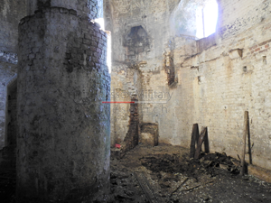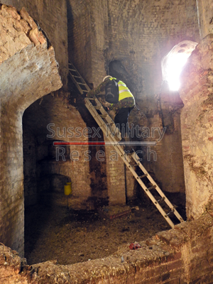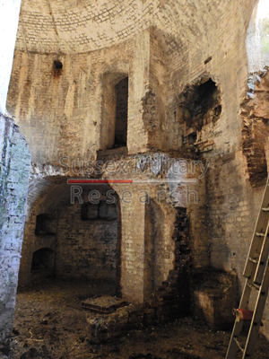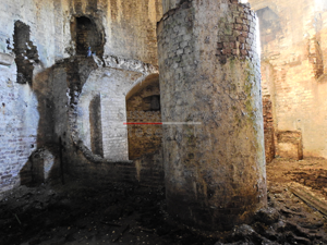 Ladders were required to access the interior and reach the roof as the internal wooden floors were missing. The magazine partition walls had been severely damaged, presumably as a 20th century attempt to open up floorspace in the structure.