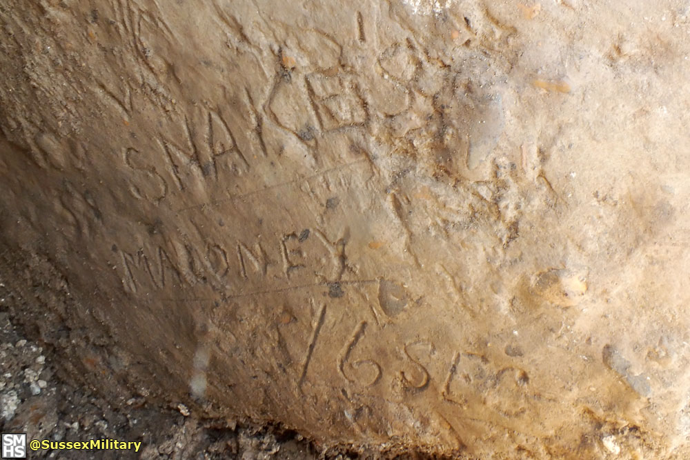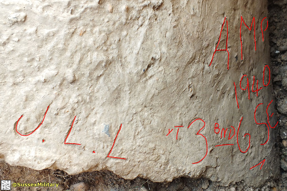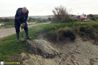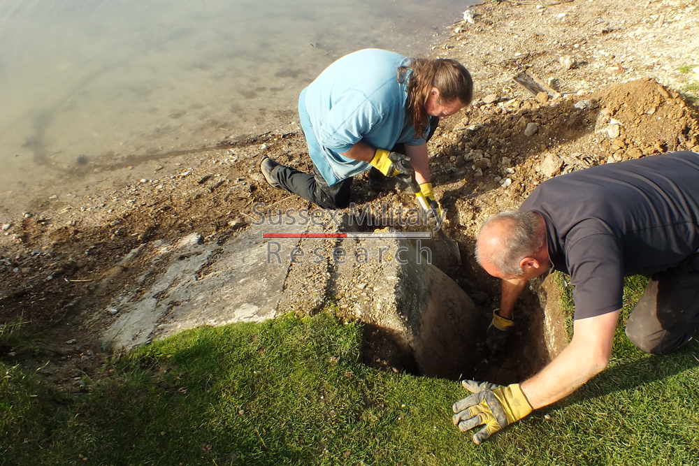 Description: Excavation of a displaced and partly buried anti-tank block in order to record wartime graffiti from 1940.