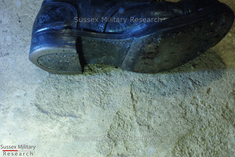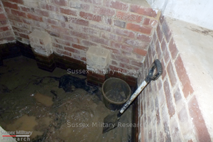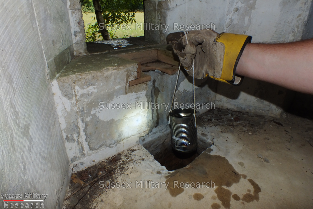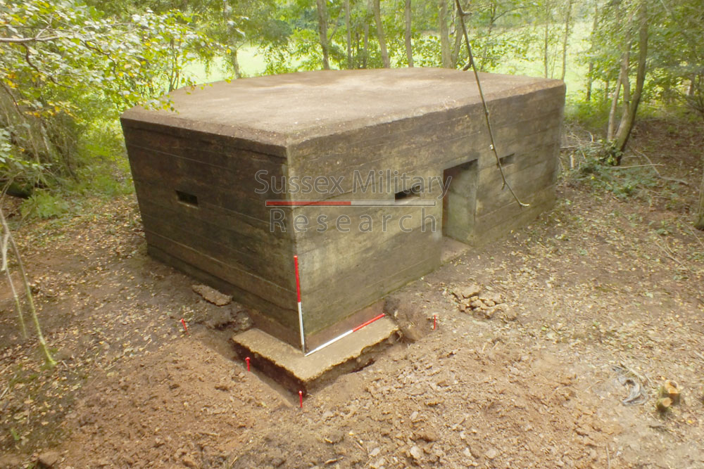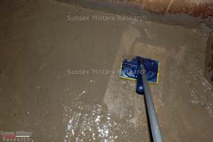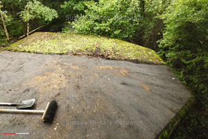 The interior was baled out (30cm deep) and cleaned, uncovering some footprints left in the concrete foundation. The exterior was cleaned and the roof cleared of vegetation. A small excavation revealed a foundation thickness of 20cm.