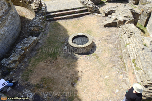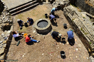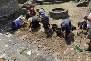 The vegetation team got down on hands and knees to try and lift a thin layer of mud and turf to reveal the cobblestones underneath. Work was done using wood and plastic tools (tent pegs, 'Y' shaped branches and a cooking spatula!) Soft tools were required to avoid scratching the cobbles. Good progress was made and by the end of the day, about 2/3 of the area around the well had been cleared.